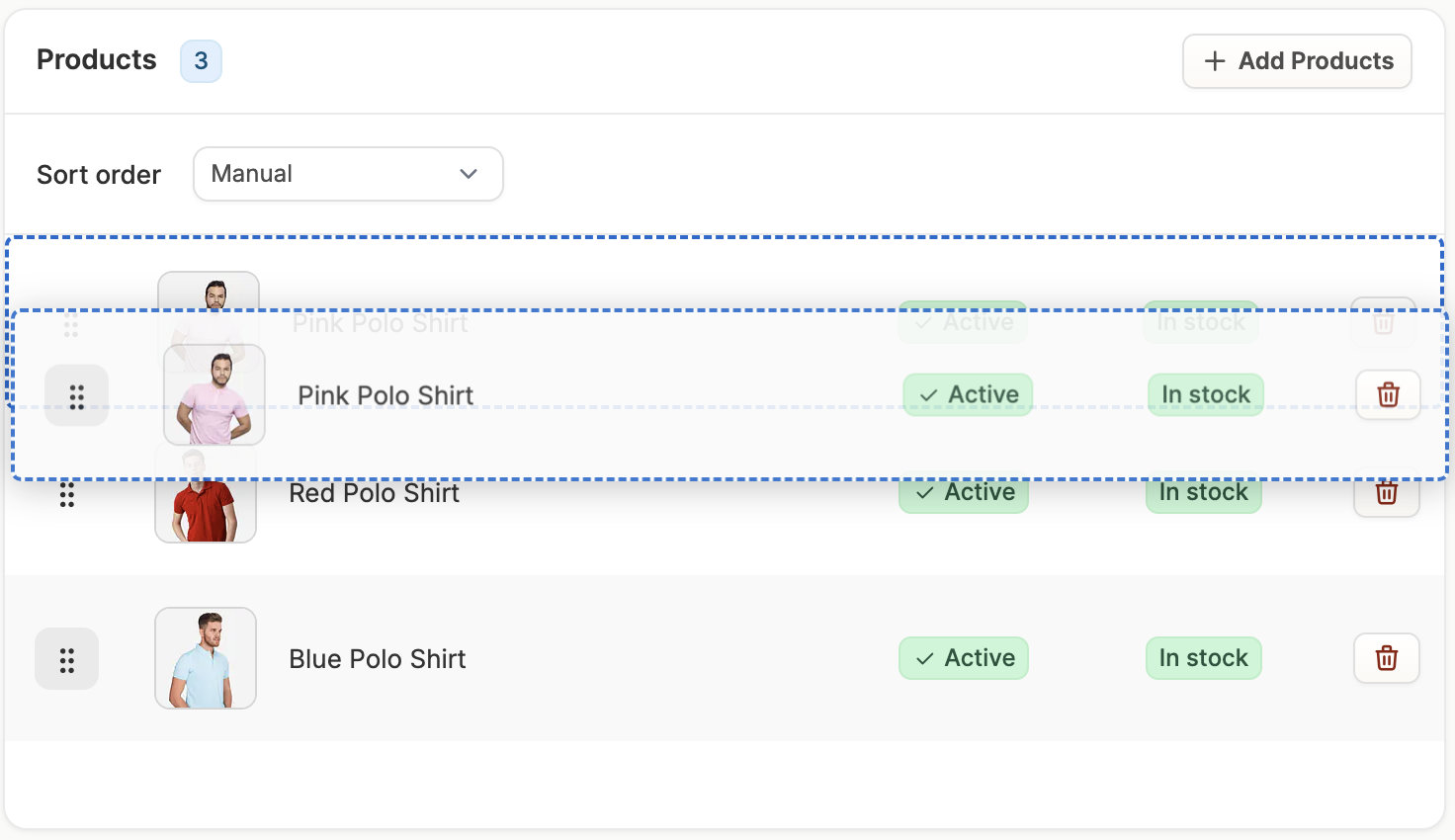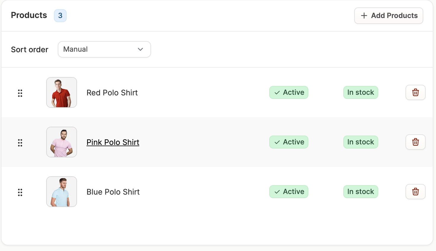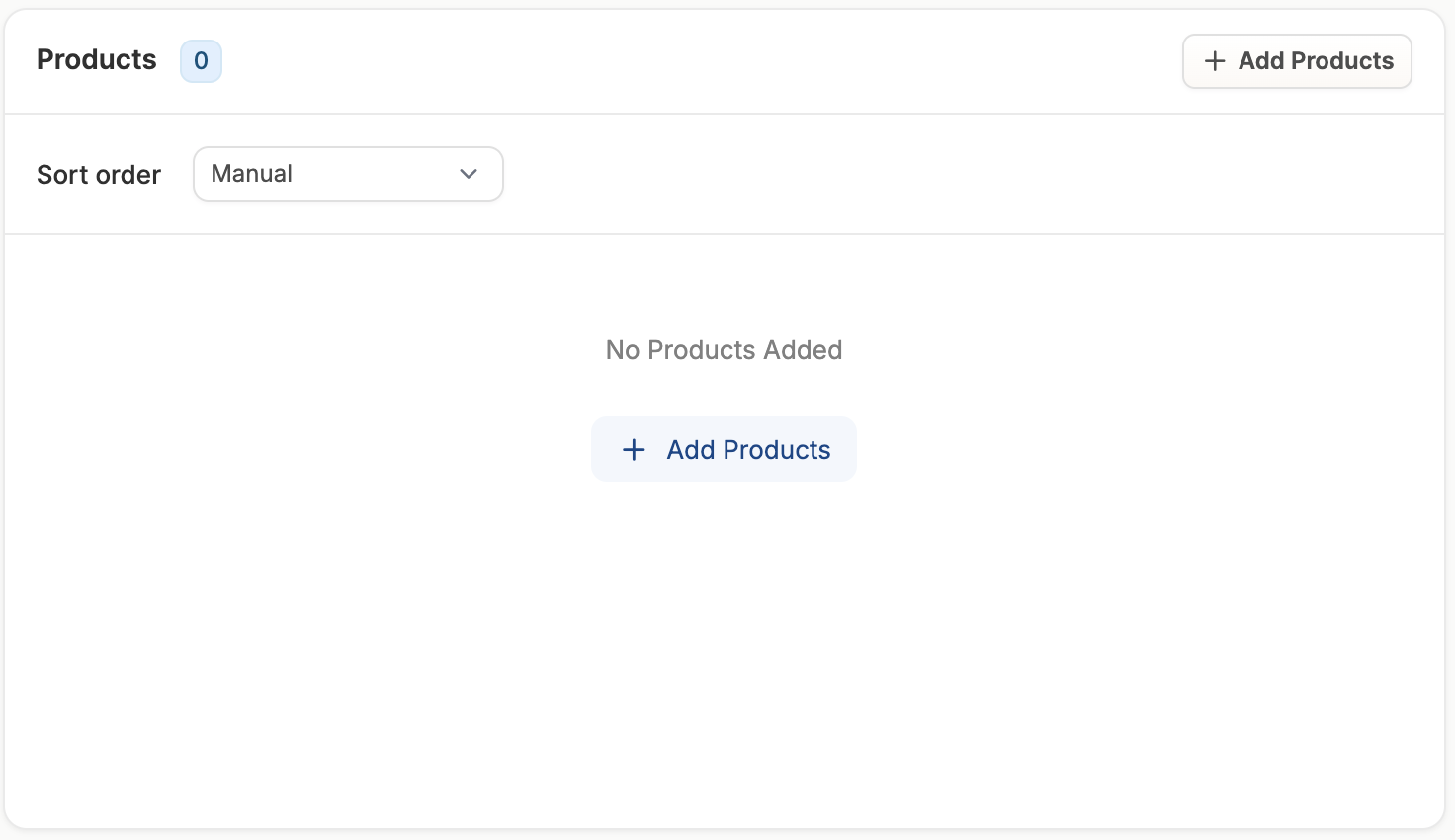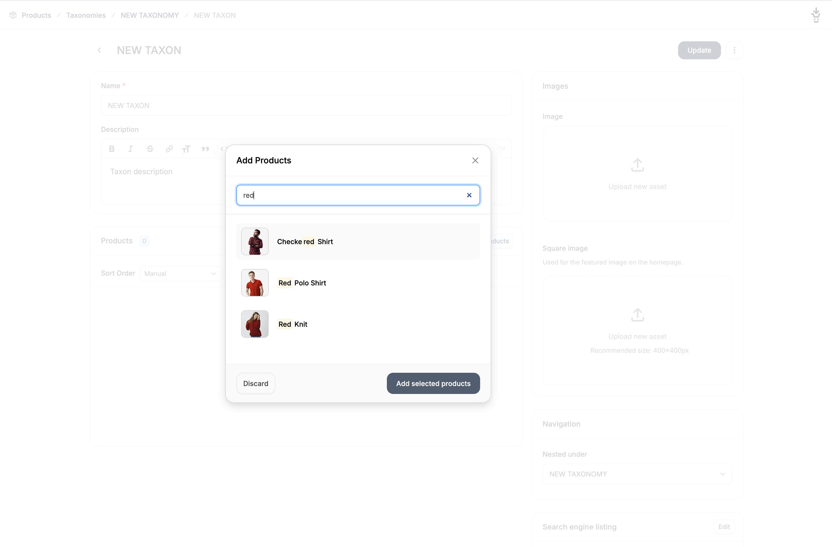 Once the taxon is created, you can add products to the taxon directly in taxon editor page by clicking Add Products, if and only if you chose the manual Taxon Type. This will open a window that allows you to search for and select the products you’d like to add.