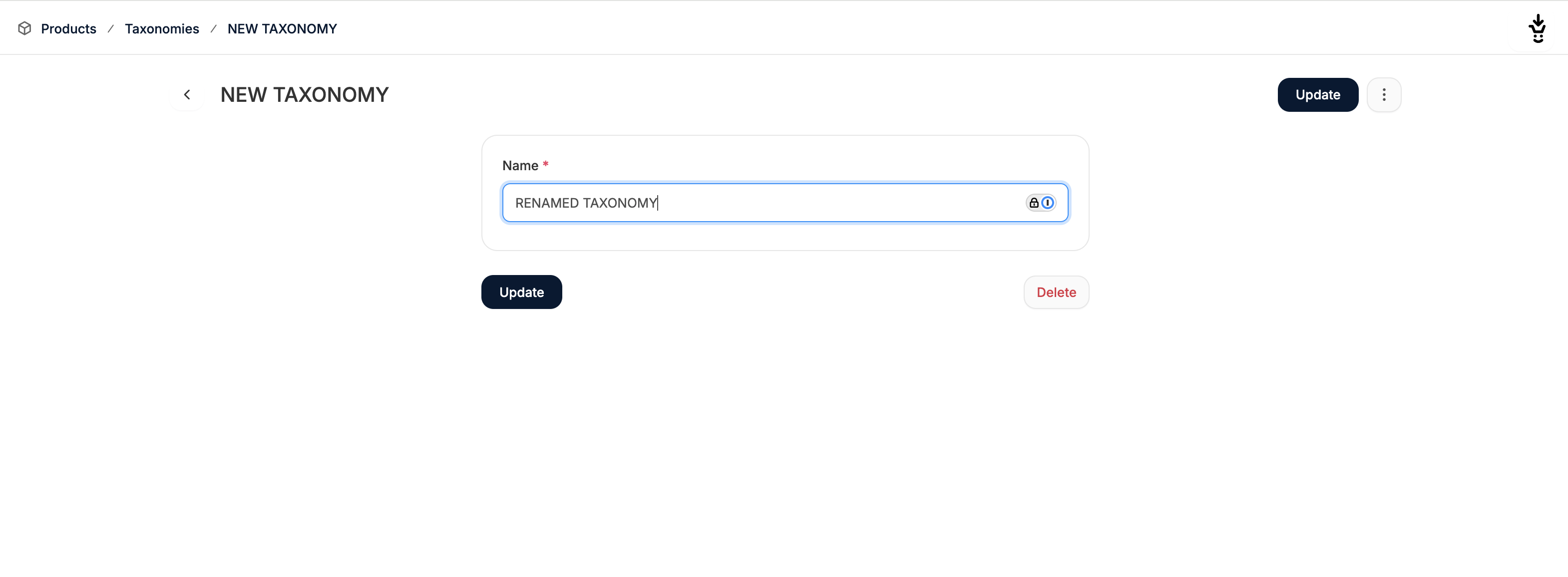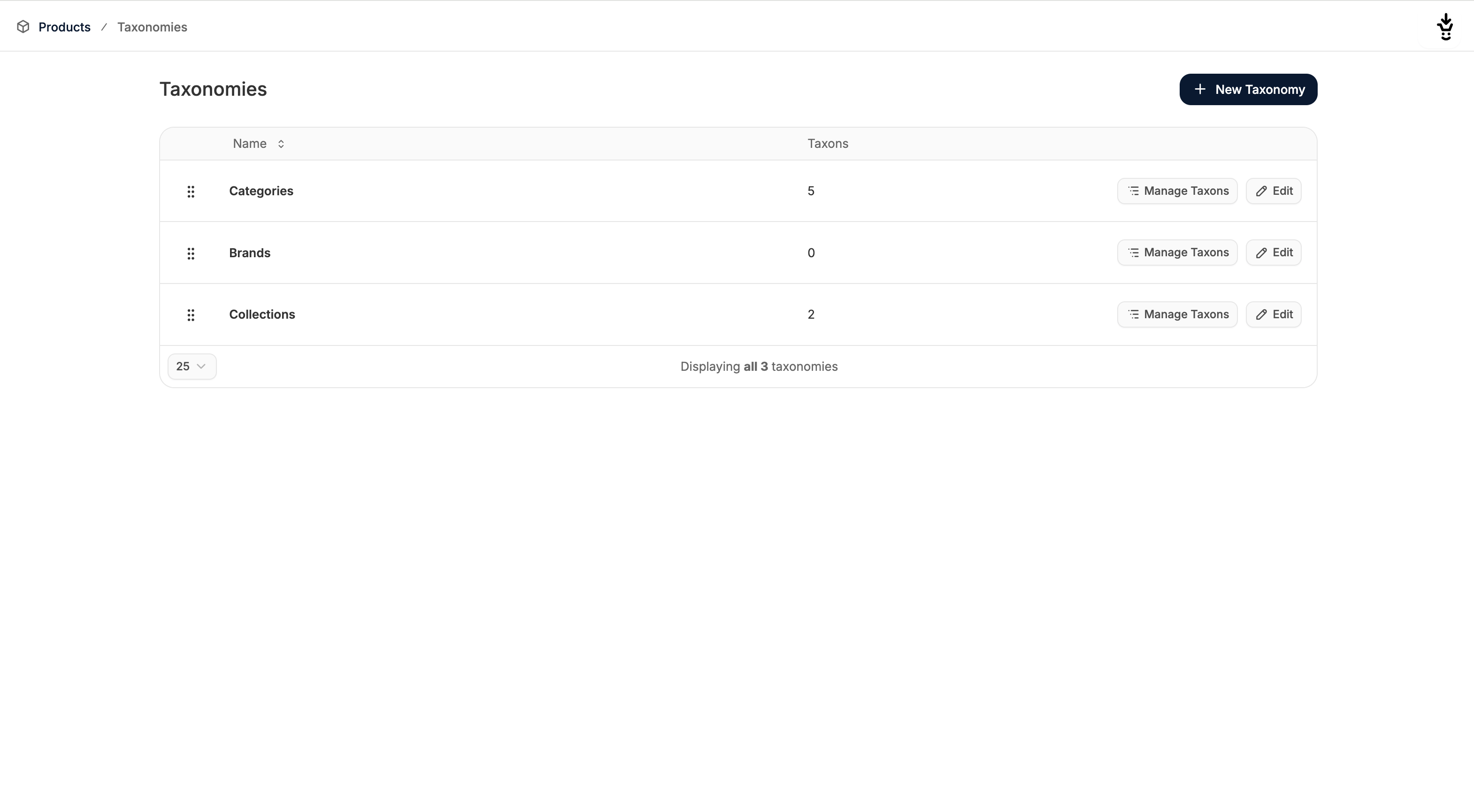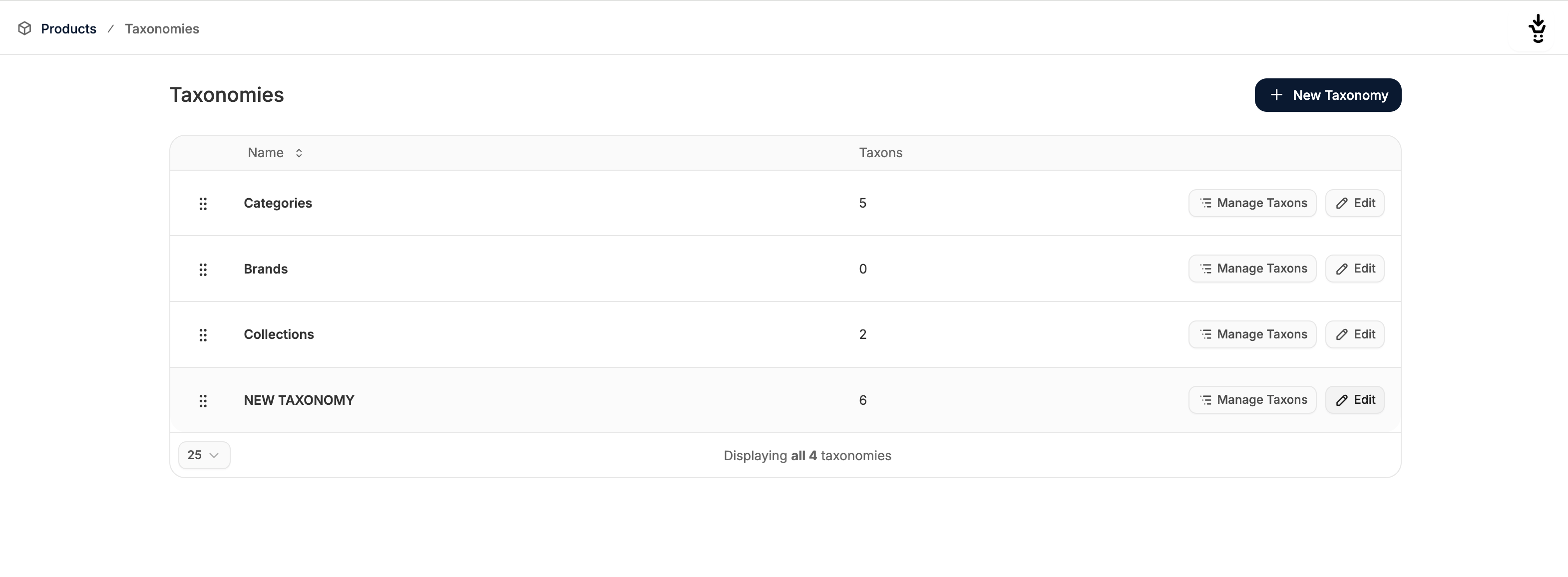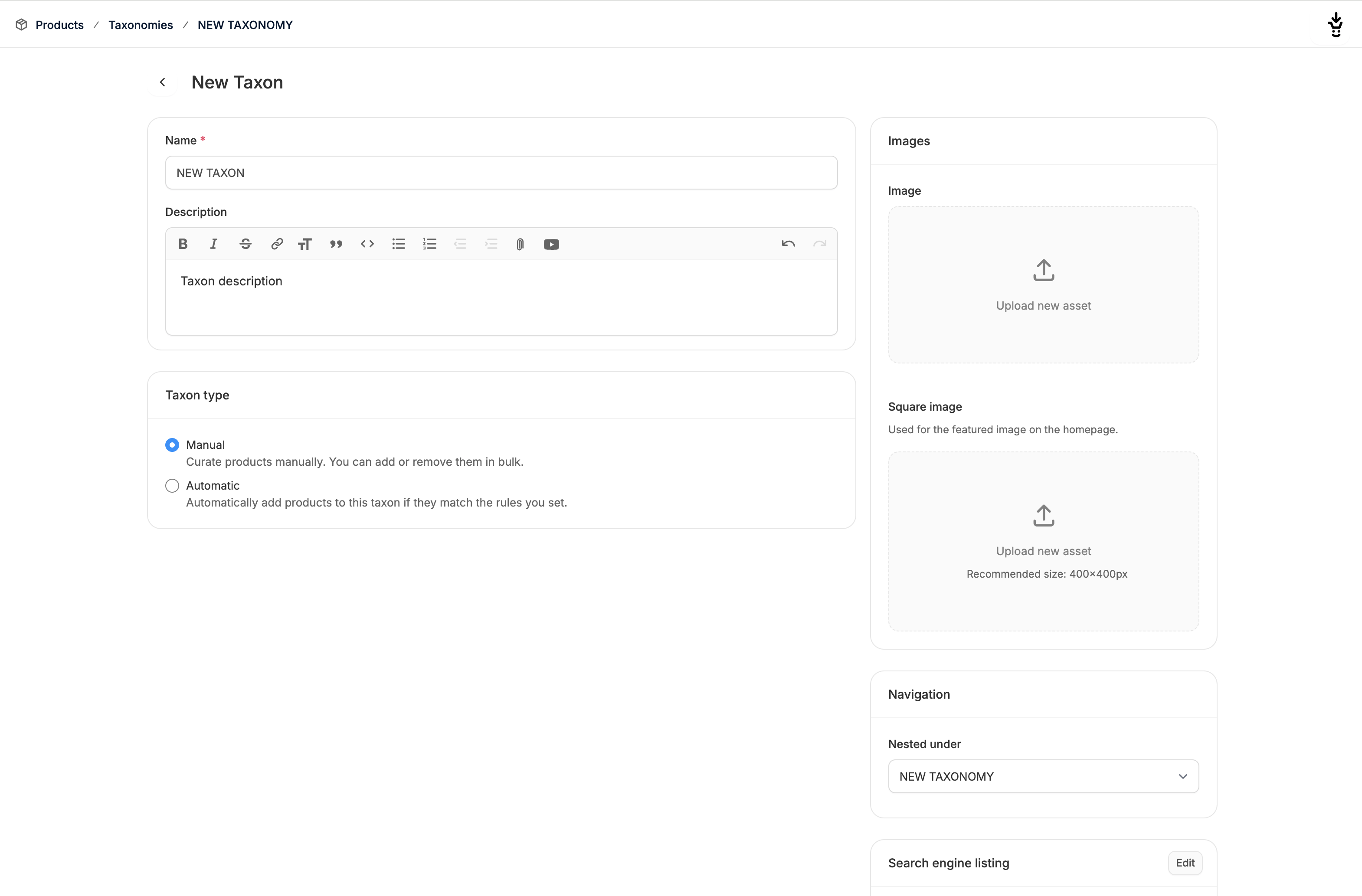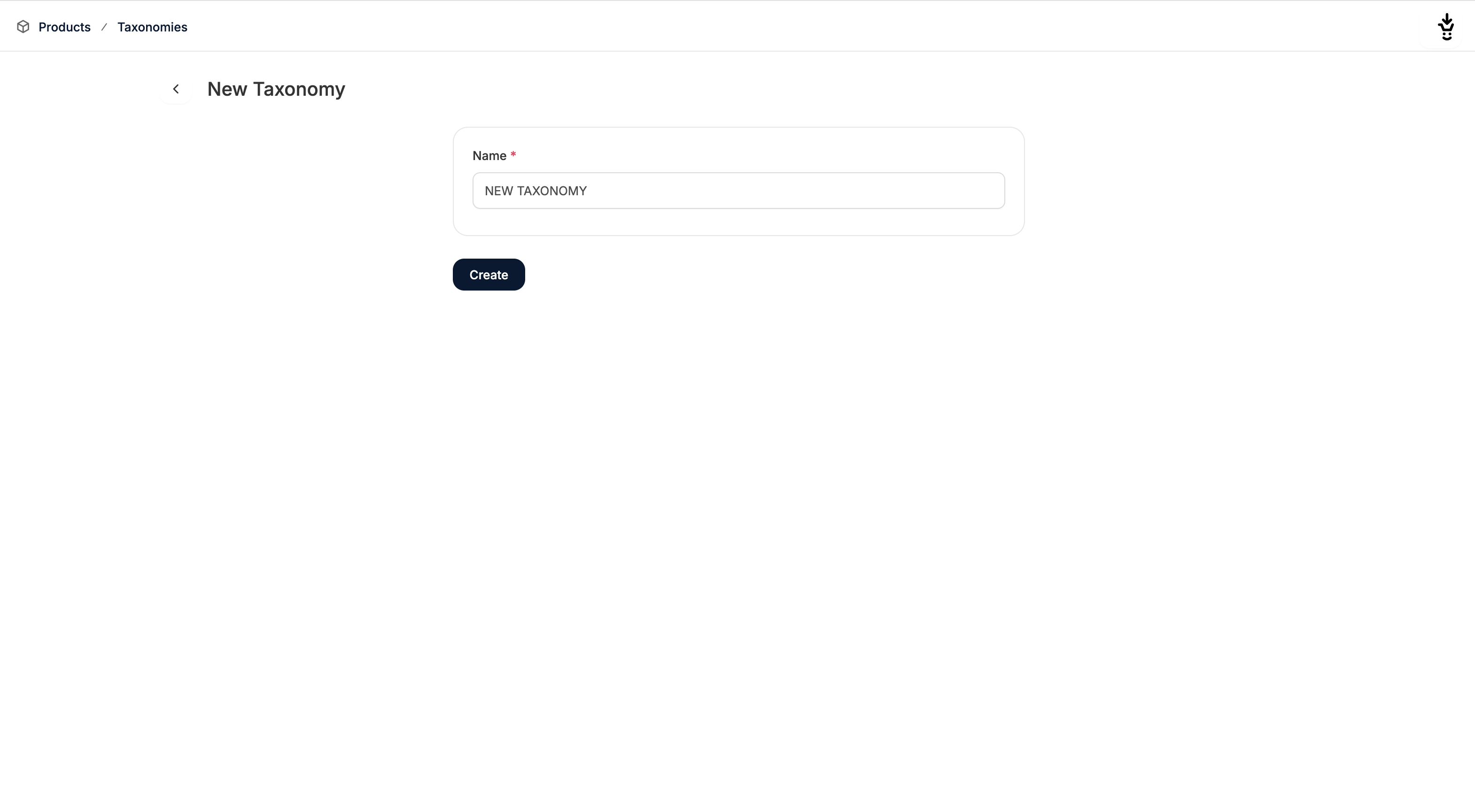 To add a new Taxonomy, such as a Category, Collection, or Brand, click New Taxon in the top right corner. This will redirect you to the Taxonomy creation page where you simply need to type in a name.