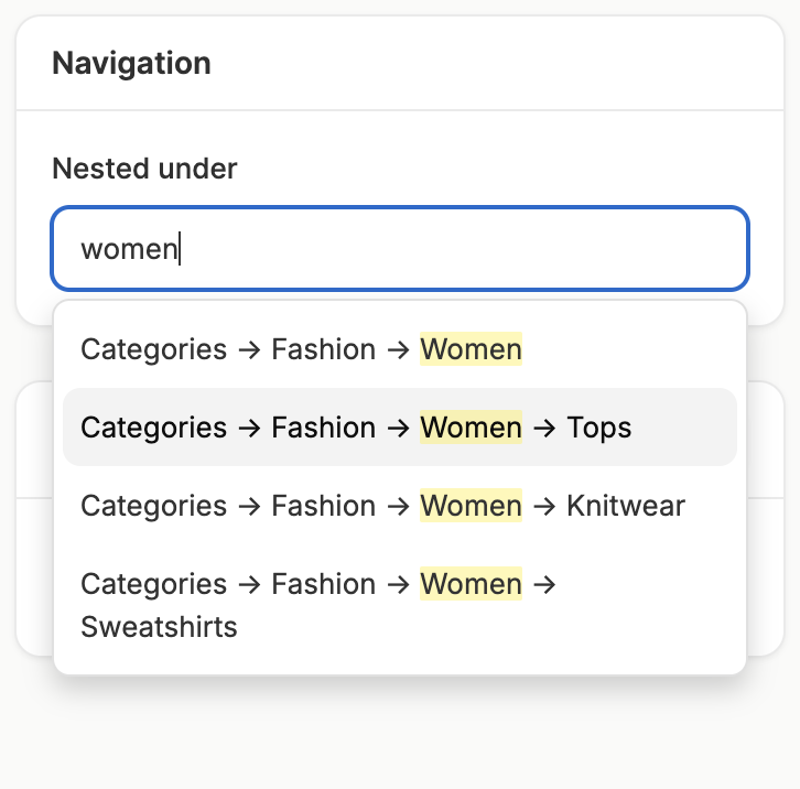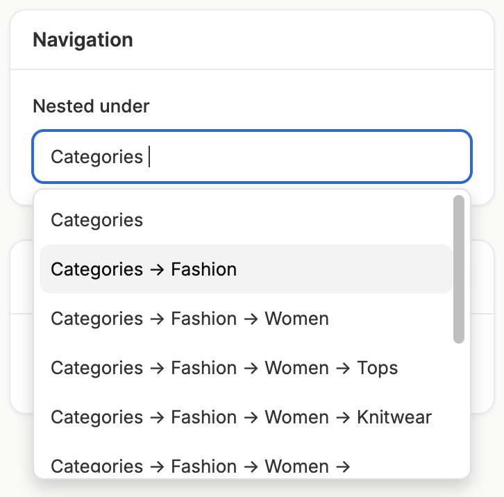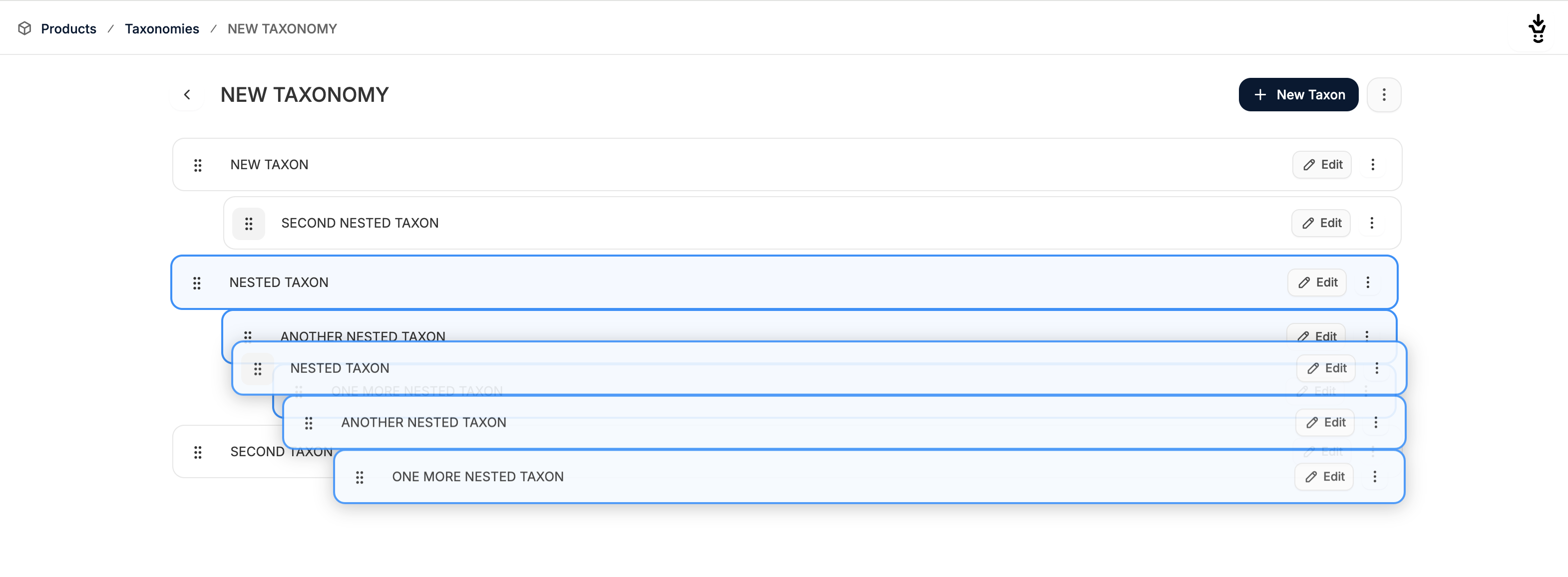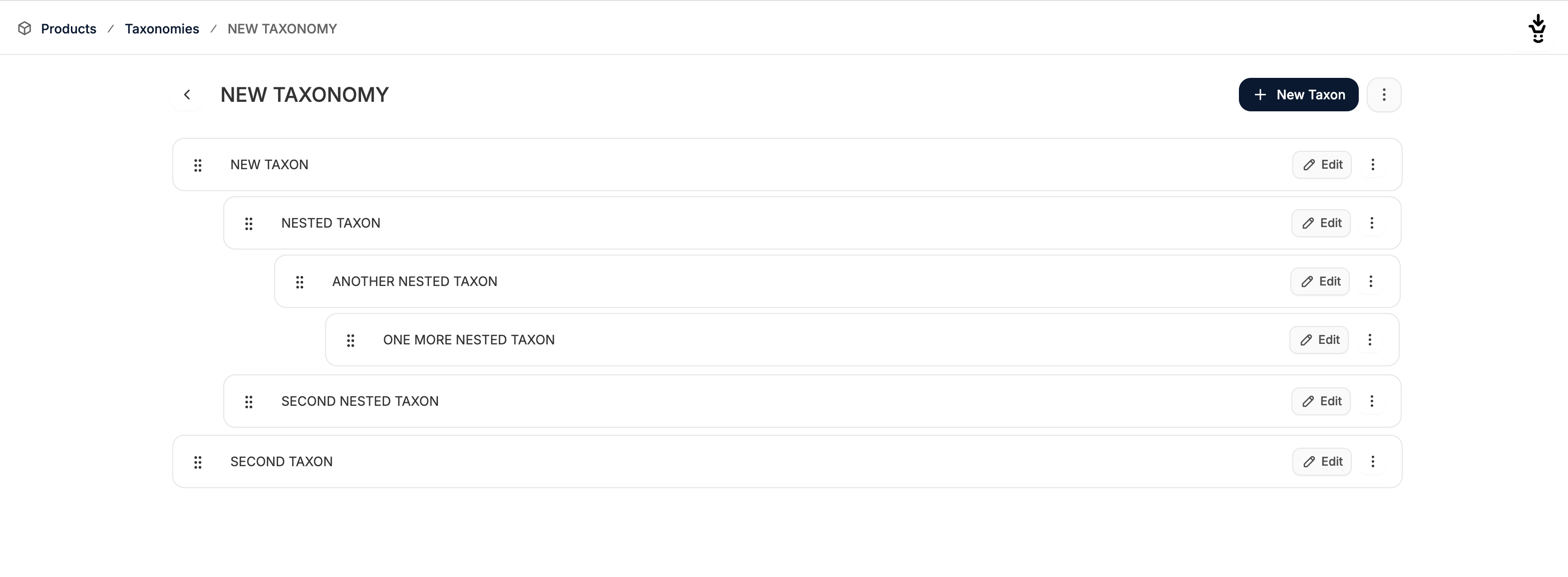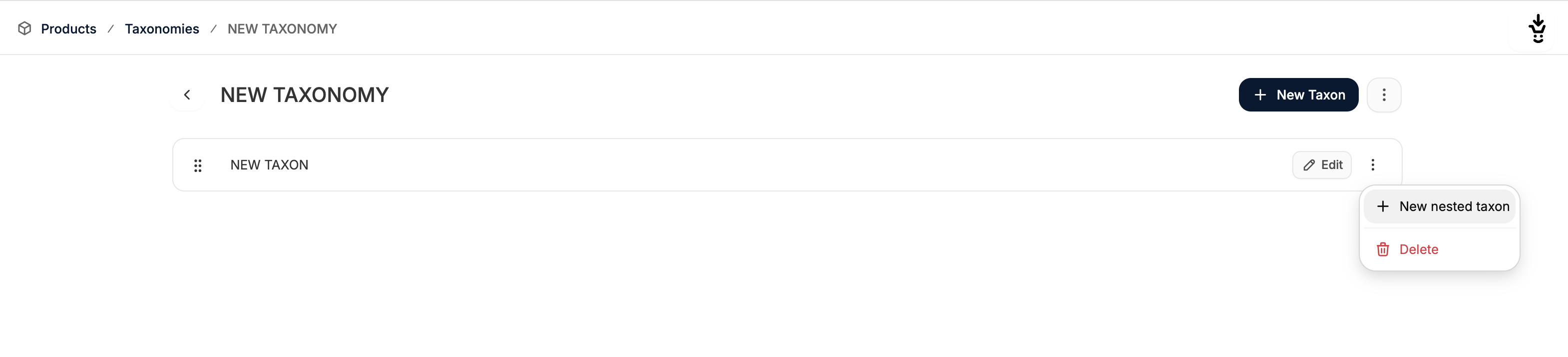 If you’d like to create multiple levels of the taxonomy tree, you can add add subtaxons (i.e. nested taxons) to an existing taxon. Simply click on the 3 dots on the far left of the taxon’s row and select New Nested Taxon.
