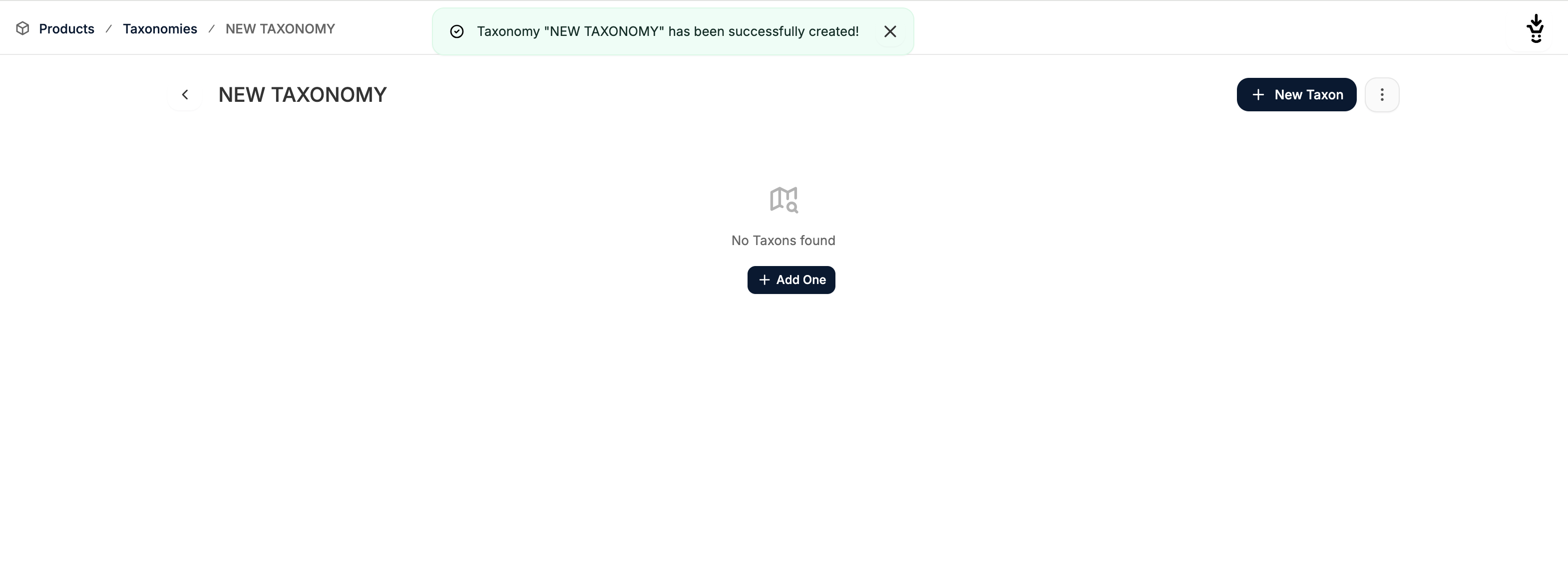 With the taxonomy created, you can start adding taxons to organize your product catalog more effectively. To add a taxon, either click New Taxon in the top right corner or (in the case of an empty taxonomy), click Add One in the middle of the page.