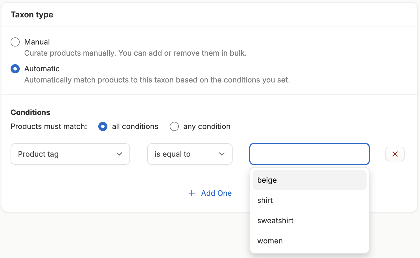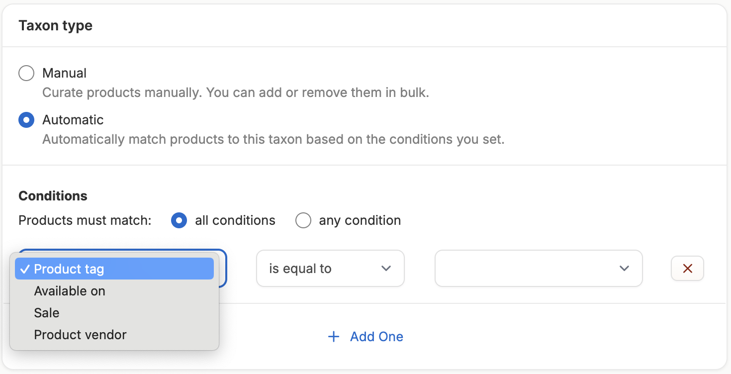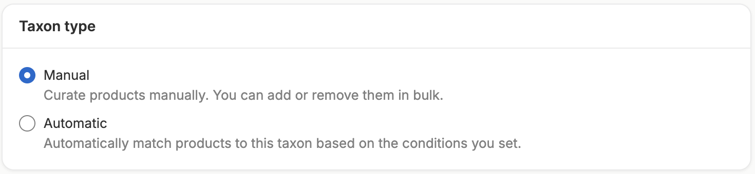 Taxon Type allows you to choose between a manual taxon or an automatic taxon.