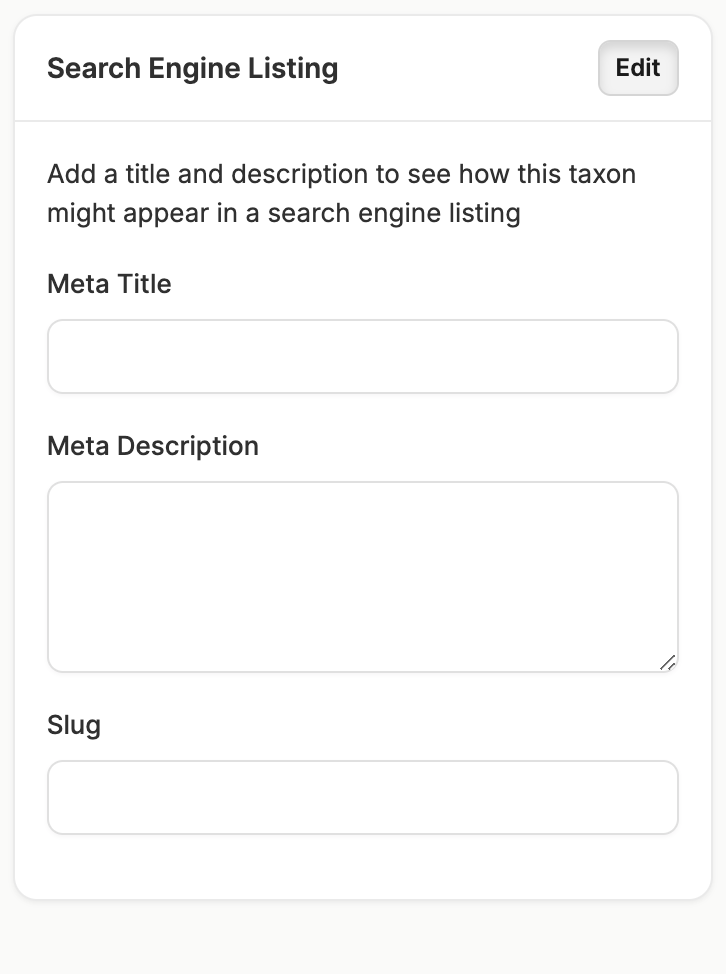 Here you can set the meta title, meta description, and the slug for the new taxon.